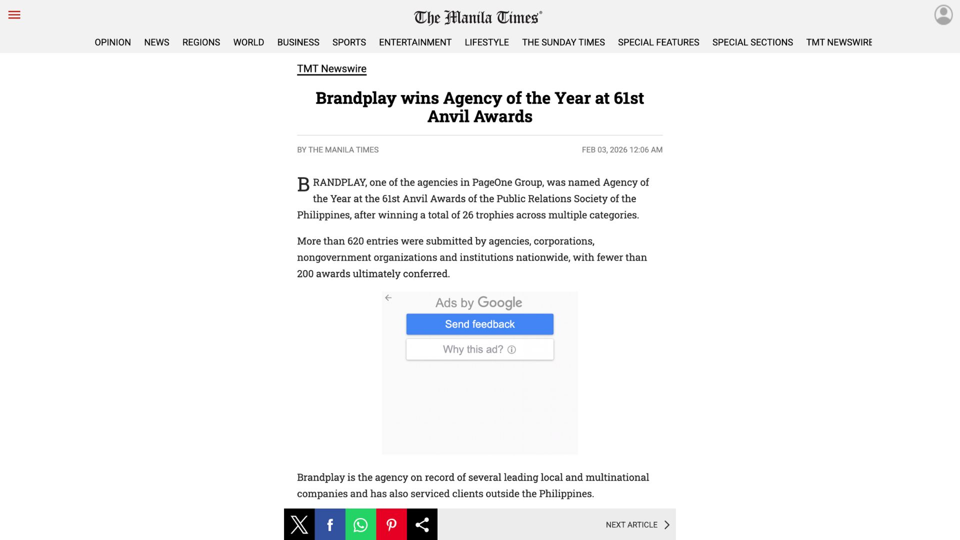 BRANDPLAY, one of the agencies in PageOne Group, was named Agency of the Year at the 61st Anvil Awards of the Public Relations Society of the Philippines, after winning a total of 26 trophies across multiple categories.